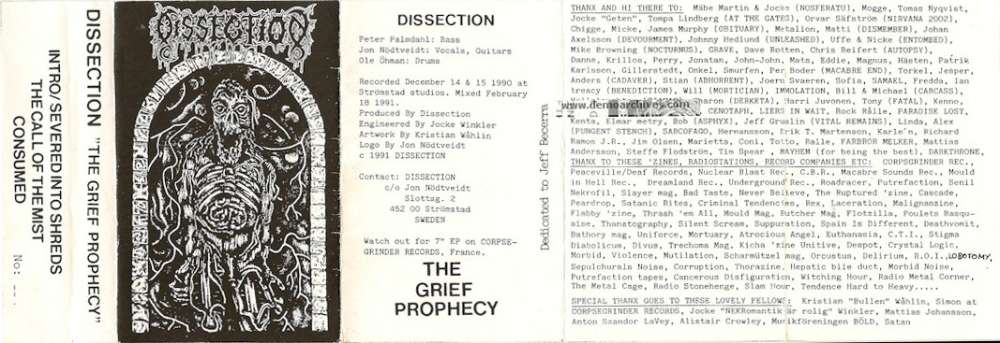 Jon Nödtveidt siempre un fanático de la música, y los orígenes de esta banda datan de 1989, la fecha de creación de la banda, donde siempre la pasión de este músico fue inclinada hacia ese estilo, por eso demostraciones de 1991 como “The Grief Prophecy” tienen influencias de ese lado más crudo del estilo y con los recursos de los años, pero dentro de aquella primer idea, se tenía algunos tintes de lo que iba pasar después, pero esa la manera de cantar de Jon era mucho más grave y era una máquina de Death Metal; pero la sorpresa llegaría en su primer EP “Into Infinite Obscurity” (1991), donde los primeros tintes melódicos y la voz de Jon se fue completamente hacia un lado agudo en su guturación, por lo que demostraciones como “The Somberlain” (1992) y “Promo 1993” (1993) tenian esa chispa o mezcla de sonidos mucho más Black y Death Metal primigenio dentro de lo melódico, y por sale al mercado su primer álbum “The Somberlain” (1993) disco que definió su futuro completamente, pero aún este disco tenía chispas de Death Metal, pero se tenía un sonido mucho más ennegrecido, donde en una entrevista de 1994 le preguntaron, como considera a la música de Dissection, y el solo dijo, “Death Metal y nada más!”.