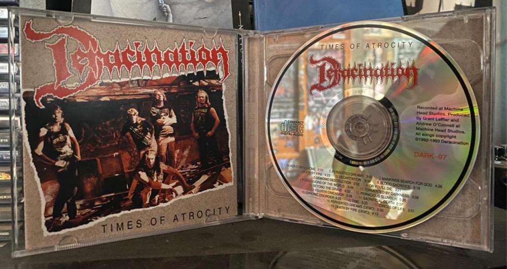 Deracination - Times of Atrocity - 1992 (Independiente)Deracination es una banda formada en 1992, donde su mayor concepto lirico es que son banda que mezcla lo gore con letras cristianas dentro del Death Metal, el cual para muchos puede ser chocante, pero como siempre digo, a mí me importa poco o nada su ideología. Ya que la banda dentro de este "Time of Atrocity" (1992) determina muy bien los parámetros extremos en cuanto al género de muerte se refieren. Inicialmente la banda se formó en 1988 bajo el nombre de Holy Rite, una banda mucho más inclinada hacía lo Thrash Metal, pero luego de dos años, ellos deciden cambiarse a Deracination, con el cual editado su primer álbum en recomendación y y luego de eso existe una demostración de 1993 y de ahí la banda para 1994 decide cerrar sus actividades. Además, como detalle adicional, este primer álbum fue editado a través de la banda, pero para el 2017, el sello Dark Symphonies lo reedito en una versión doble en CD, donde incluye su primera demostración y las grabaciones de cuando eran una banda de Thrash Metal, y solo fue editado a mil copias. Un disco que pasó desapercibido por cualquier recomendación, pero que al final es una joya infravalorada dentro del Death Metal. Todo un deber tenerlo.
