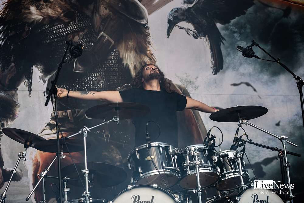 Bloodbound: En el primer álbum, cuando no estaba en la banda, tenían una estética de black metal auténtico, y Bloodbound surgió un poco después del gran power metal. Cuando todo se recompuso con Hammerfall, Edguy y todas estas bandas, y Bloodbound llegó unos años después, para destacar, ¿sabes?, ¿cómo deberíamos hacerlo? Y usaron este maquillaje de black metal. Pero en esa época, sentían que, al hacer conciertos, el maquillaje era muy pesado, y sobre todo el baterista se cansó porque sudaba constantemente y el maquillaje se le corría por todas partes. Así que lo dejaron. Pero ahora tengo, ya sabes, cuernos y maquillaje, y aun así es importante destacar un poco. Empezó como una broma, esos cuernos que tengo, porque íbamos a hacer una sesión de fotos para el álbum Stormborn. Y hablamos sobre qué podíamos hacer para destacar un poco, pero, aun así. Eso encaja con nuestra temática y nuestra música, y Thomas dijo: «Quizás deberías usar trompetas». Lo dijo en tono de broma. Luego, tomó un bolígrafo y me quitó esos pequeños detalles: «Si tienes un bolígrafo así, puedes aflojarlo». Así que los tomó y me los pegó justo en la sesión de fotos y dijo: «Sí, ahí lo tienes». Tienes la trompeta, porque ese álbum trataba sobre dragones, la temática de los dragones. Y siempre tenemos a Nosferatu desde el primer álbum, Nosferatu. Tenemos a Nosferatu con diferentes formas en cada portada, como Eddie de Iron Maiden, pero en su lugar tenemos a Nosferatu. Y eso encaja con el tema. Lo probamos. Parecía un poco ridículo, pero funcionó porque a la gente le gustó. Y ahora es solo parte de nuestra temática y de cómo nos vemos en el escenario.