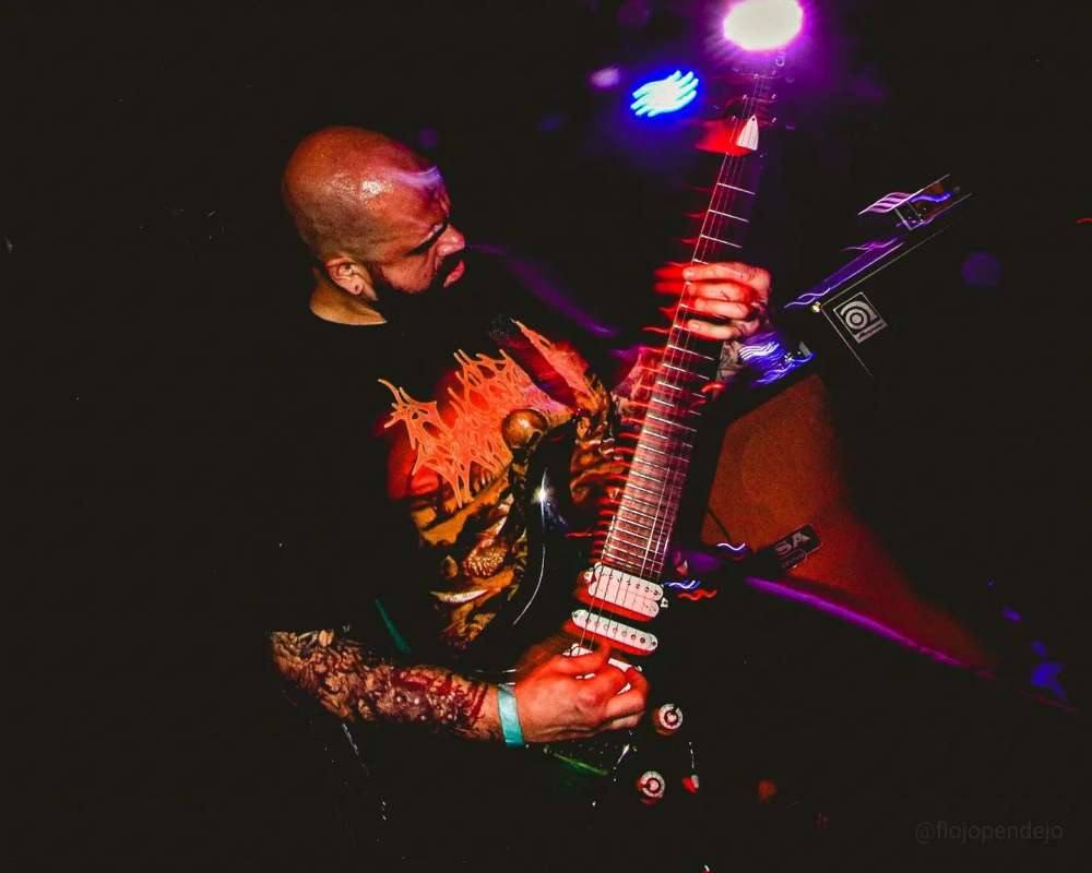 Y entonces, básicamente, fue cuando mi baterista, Eric, y yo nos encargamos de la mayor parte de la composición, y empezamos a practicar semanalmente para asegurarnos de que pudiéramos empezar a generar nuevas ideas y cosas así. Porque mucha disentería es lo mejor. Y mucho de lo que nos permite llamarla disentería viene de mi baterista y de mí, asegurándonos de que tengamos una buena fluidez. Puedo, puedo desarrollar muchas ideas por mi cuenta. Pero es cuando desarrolla mejor los ritmos de batería que nos permite progresar un poco más en nuestras canciones. Así que, ya sabes, muchas de las canciones del álbum tienen las últimas partes escritas improvisando en el espacio, como si dijéramos: «Me gustan los primeros tres cuartos de la canción». Pero aquí está mi idea para la última parte. Está basado en una de tus ideas, pero tiene un toque de groove, un ritmo diferente o algo explosivo. Así que, con el tiempo, después de grabar muchas maquetas y cosas así, volvimos a improvisar. Y pudimos traer tres cuartas partes del álbum, que se armó de diversas maneras. Y luego, básicamente, lo volvemos a licuar y, como que, lo volvemos a triturar todo para asegurarnos de que tuviéramos un álbum completo y cohesivo, porque, obviamente, el metal es mucho. Es una colección de canciones que se improvisan en el espacio de ensayo. Pero realmente intentamos asegurarnos de que, al lanzar un álbum o una grabación completa, que se sienta como un producto completo, un sándwich completo, una comida, lo que sea, queremos que se sienta completo de principio a fin. Y eso definitivamente requirió un poco de trabajo para armar el álbum.