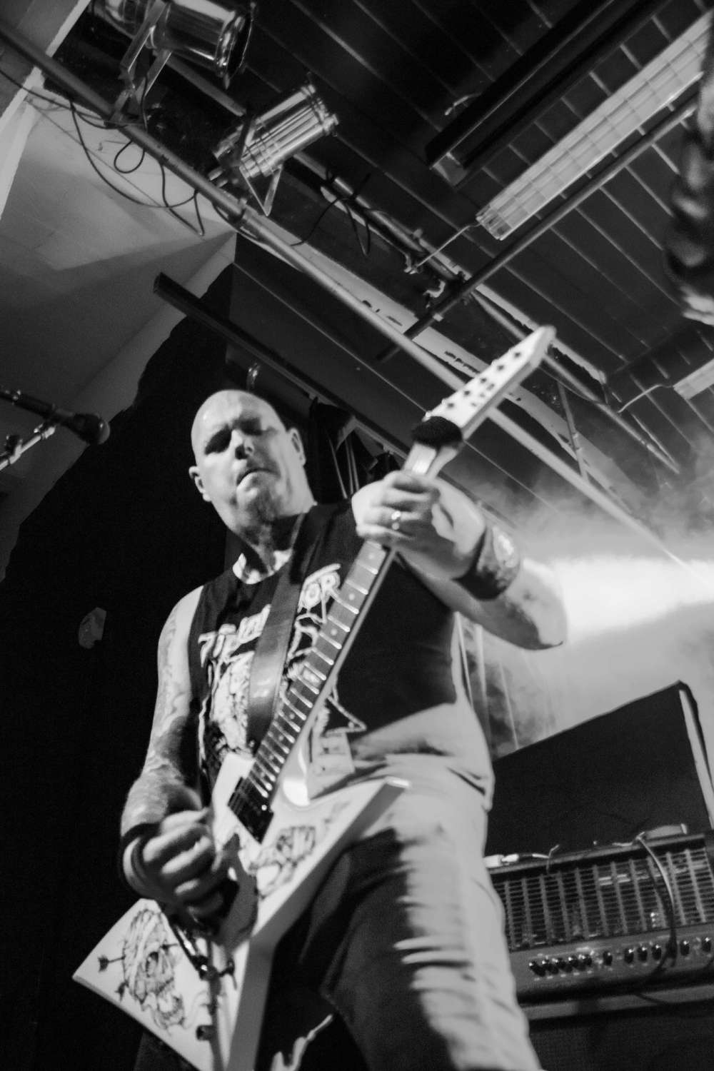 Mezzrow: Cuando retomamos la banda, no sabíamos otra forma de tocar que como en los 80. Pero Magnus, nuestro guitarrista, tiene mucho talento y viene de la escena del death metal melódico, así que nos lo trajo. Así que, al componer canciones, hemos cambiado un poco el enfoque: soy un tipo de la vieja escuela. Soy del Área de la Bahía. Para mí, el Thrash es Viol-ence, Testament, Death Angel, ya sabes, paganos. Pero para Magnus, es como si escuchara de todo y eso se nota en sus canciones. Y eso es un gran cambio para nosotros. Y creo que es una de nuestras inspiraciones a la hora de escribir los estribillos de las canciones, pero como no es así, si escuchas el primer álbum, entonces llegó la matanza. Todas las canciones suenan casi iguales. Algunas son geniales, pero si escuchas el álbum completo, te aburres un poco de las cuatro o cinco canciones, quizás porque son muy parecidas. Hoy en día, intentamos ser un poco diferentes. Cada canción tiene su propia vida. Y creo que eso es un gran cambio con respecto a los 90 y los 80. Pero también debes recordar que en los 80, tenía unos 18 años cuando empecé a tocar. Y cuando tienes 18 o 20 años, juegas con el corazón. No juegas tanto con la cabeza. Hoy en día, es casi lo contrario. Tocas, sigues teniendo el corazón, pero usas más la mente. Así que piensas en la música de otra manera, quizás con más madurez. Y no es raro hacerlo porque eres mucho mayor. Así que creo que es un gran cambio en comparación con antes. Pero como dije antes, es genial ver que tantas bandas siguen tocando, y a nuestra edad, porque nos conocemos, a veces tocamos con ellas. Si, por ejemplo, tocas con ellos un par de veces...