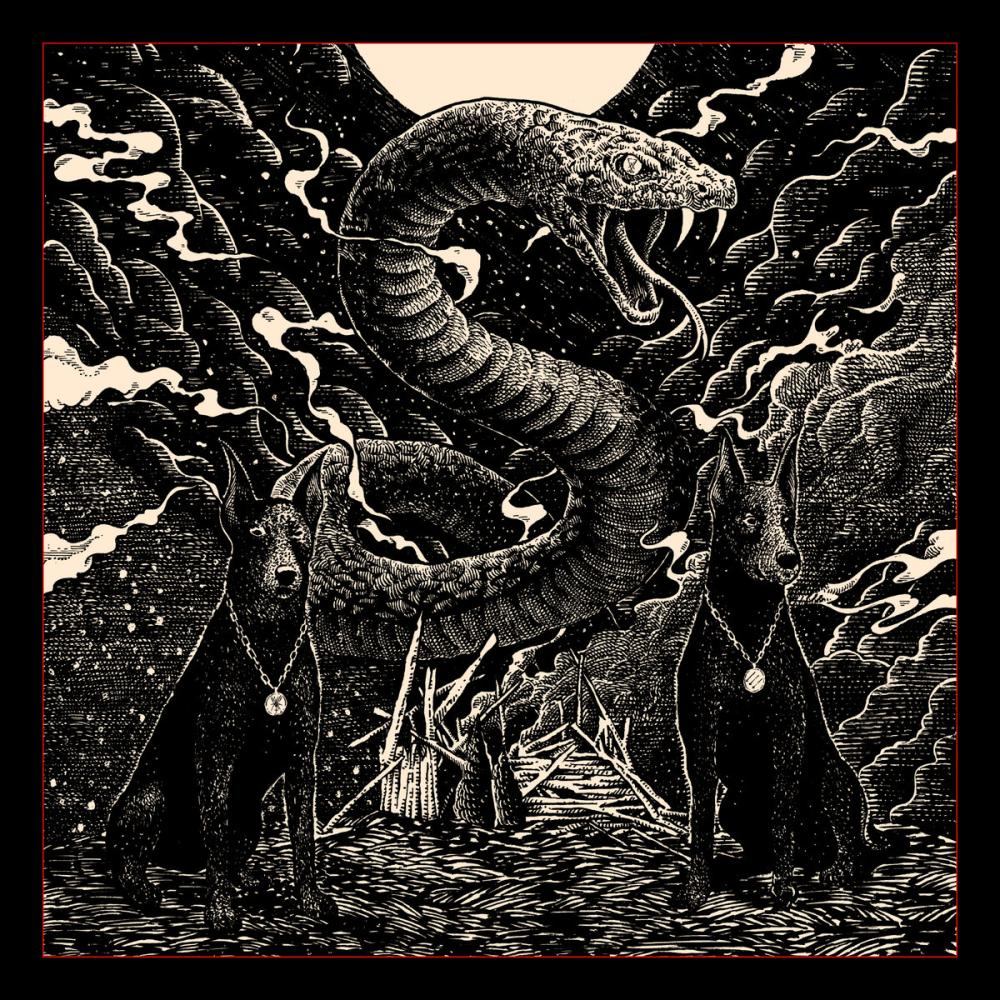La portada tiene como protagonista a una serpiente, resguardada por dos perros doberman, como si fuesen guardianes transformados en perros, todo en blanco y negro, con una textura de ilustración de libro antiguo, interesante.